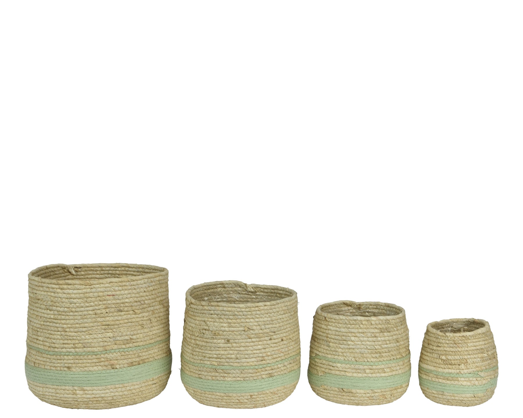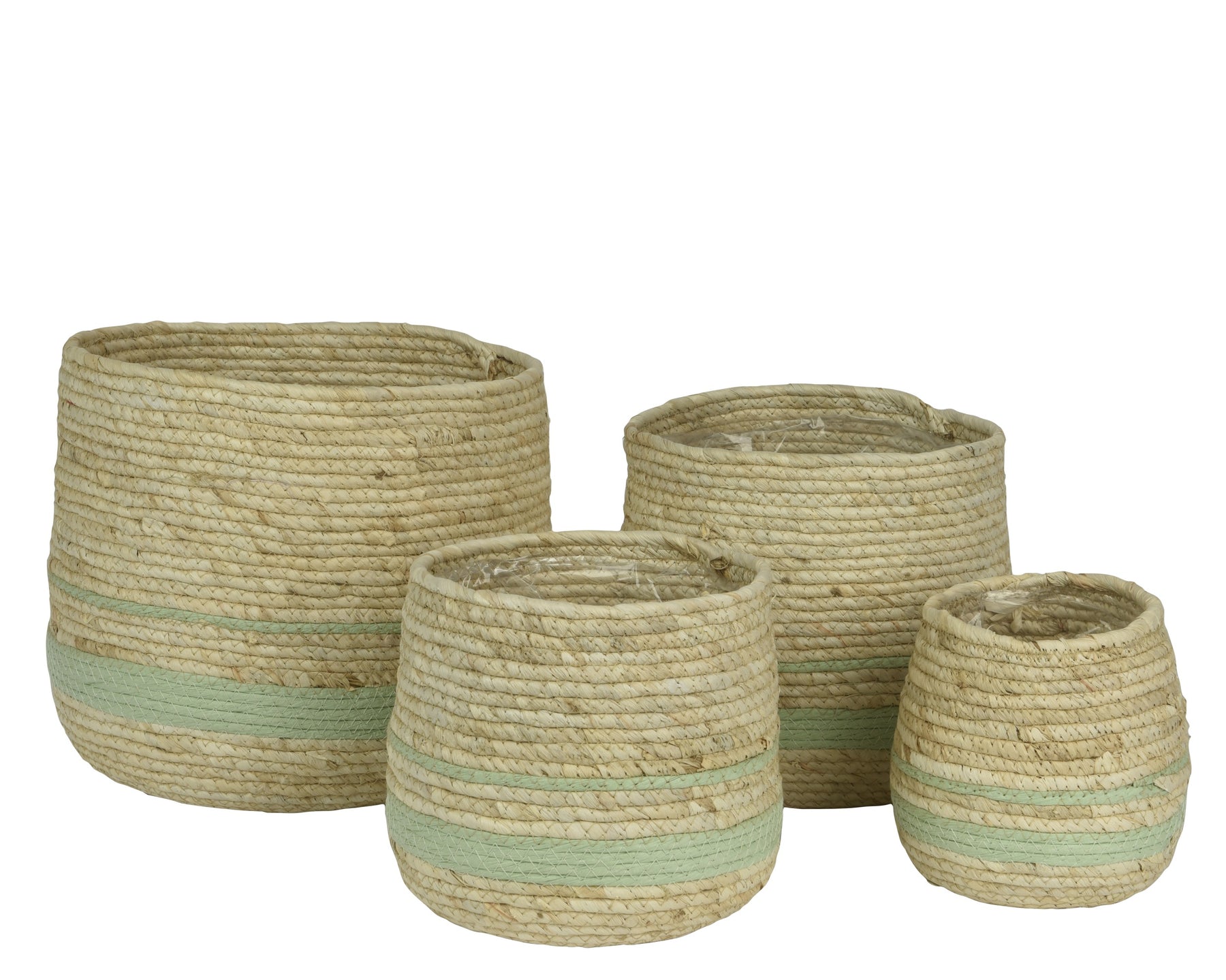 Porta un’atmosfera calda e naturale nei tuoi ambienti con questa fioriera rotonda in cornleaf verde, realizzata a mano con fibre naturali. La texture intrecciata e il colore verde delicato creano un look rustico ed elegante, perfetto per interni dallo stile boho, country o naturale.