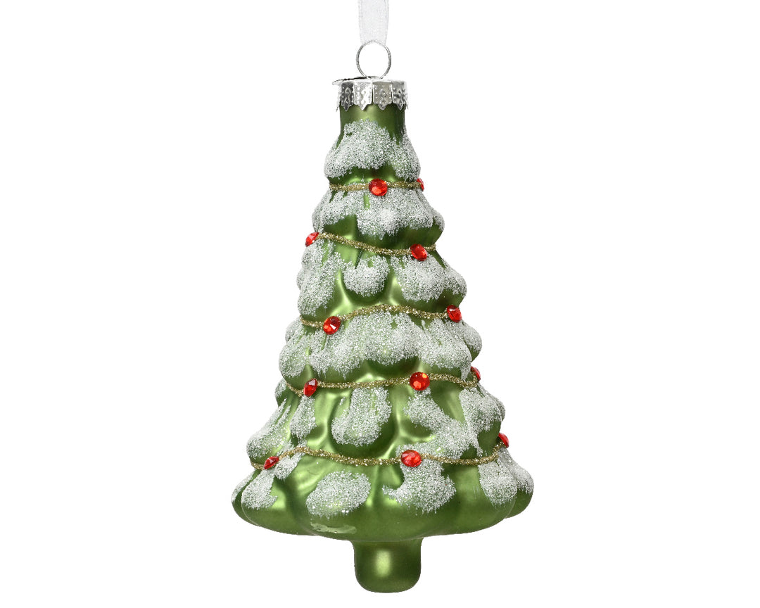 Alberello in Vetro con Paillettes, Perline e Fiocco di Neve Ø 7,5 × H 12 cm – Rosso (cod. 122244)