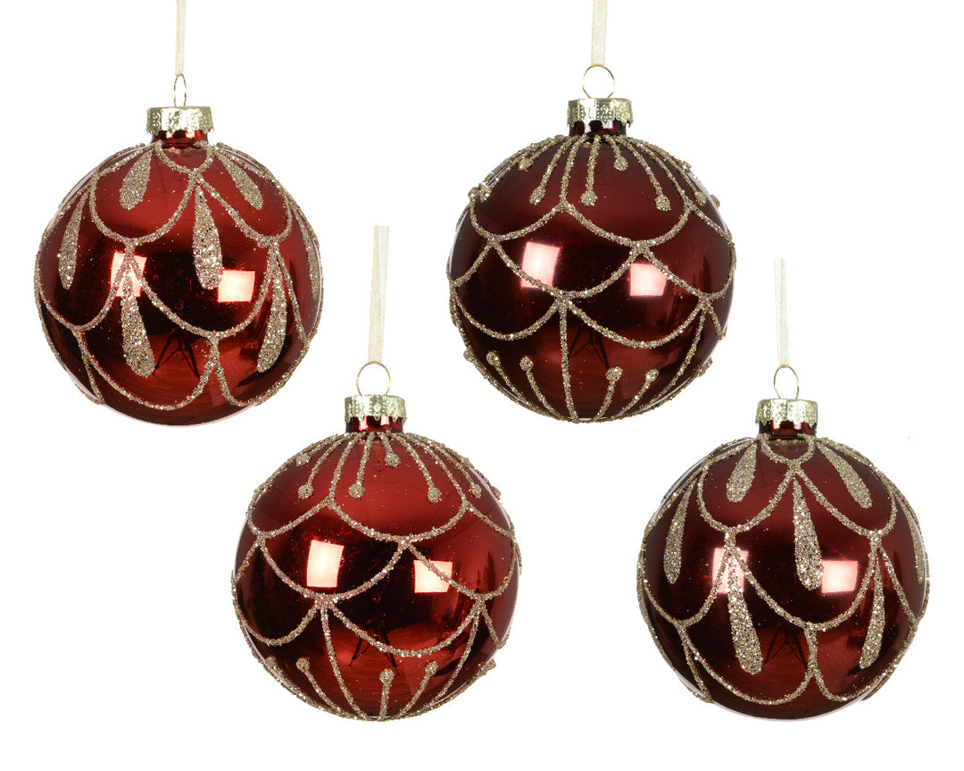 Set 12 Palline in Vetro Ø 8 cm – Rosse con Glitter Oro, 2 Tonalità e 2 Disegni (cod. 071360)