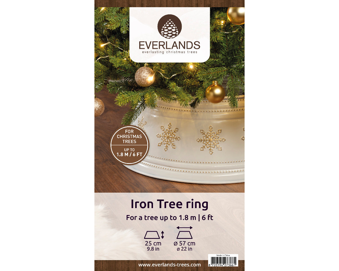 Il copri base albero Everlands in struttura metallica di colore bianco e oro è perfetto per rifinire con eleganza l’area alla base dell’albero di Natale. Con un diametro di 57 cm e un'altezza di 25 cm, è adatto per alberi fino a 180 cm di altezza (a seconda del modello). Il design pieghevole (knock down) consente un montaggio rapido e una conservazione compatta.