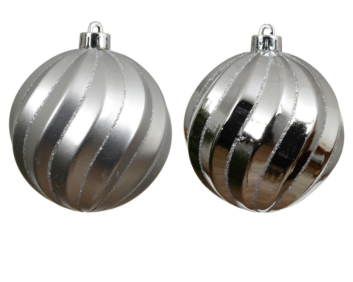 Set da 6 palline natalizie color argento in plastica infrangibile, Ø 8 cm, finiture miste lucido e opaco. Include filo per appendere. Perfette per un albero elegante e sicuro.