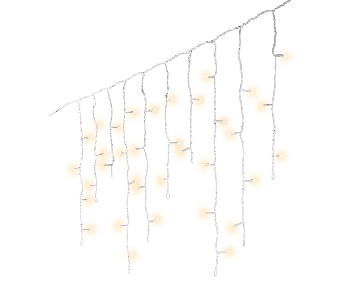 Catena luminosa a ghiacciolo con 490 LED bianco caldo, con 8 funzioni ad effetto scintillio e timer. Lunghezza 20 m con altezza massima 50 cm: ideale per balconi, facciate, terrazze e giardini. Cavo bianco, trasformatore incluso e certificazioni europee. Una decorazione luminosa elegante, perfetta per creare un’atmosfera calda e accogliente durante le feste.