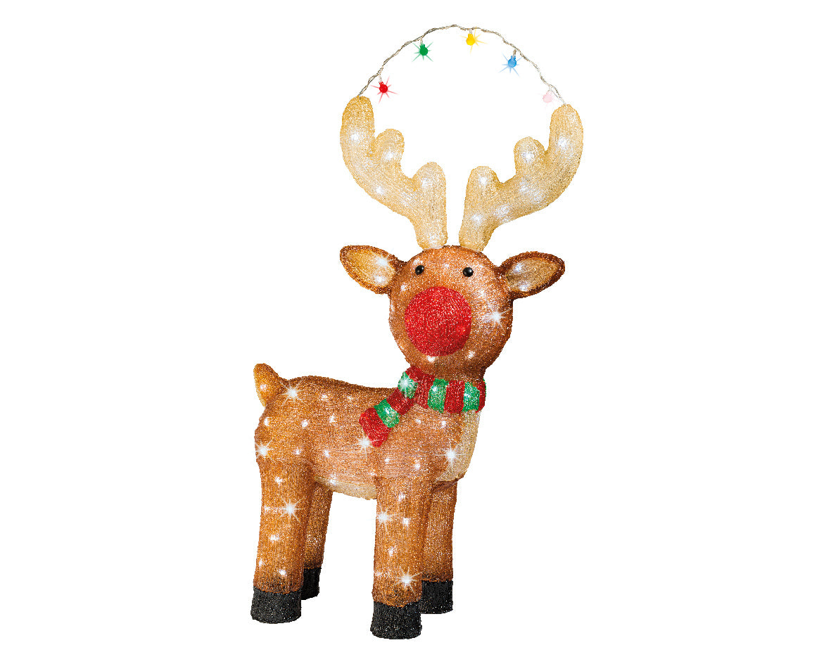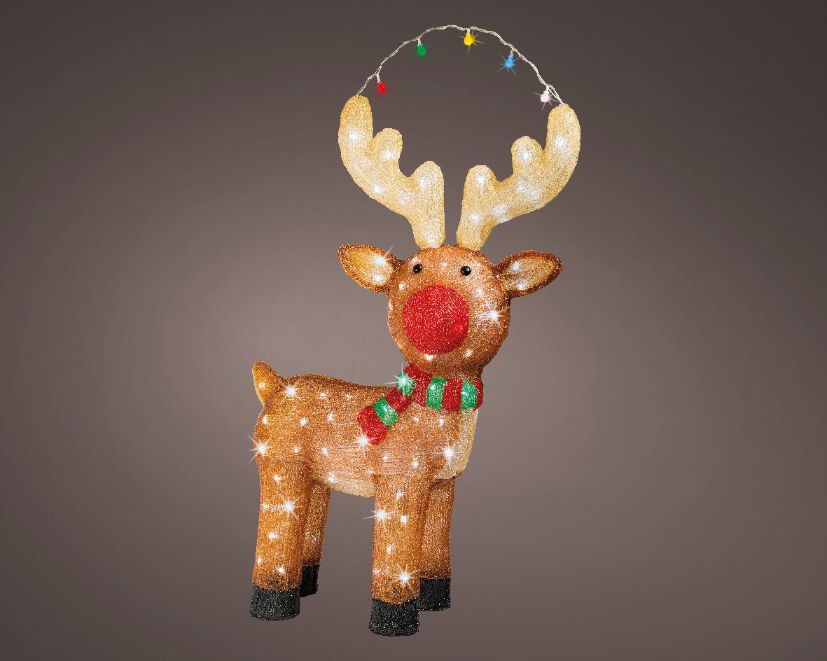 Decorazione natalizia a forma di renna marrone realizzata in acrilico, illuminata da 120 LED bianco freddo con effetto flashing. Alimentazione tramite trasformatore (31V/3,6W) incluso, cavo trasparente da 5 m, con timer 8 ore. Progettata per resistere alle intemperie con grado di protezione IP44, perfetta per decorazioni esterne.