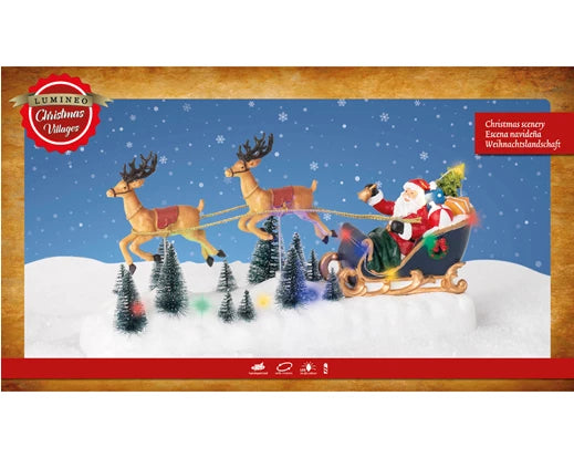 Affascinante scena natalizia luminosa in plastica raffigurante Babbo Natale con le renne, illuminata da 13 LED multicolore con effetto lampeggiante (flashing). Dotata di movimento e ideale per arricchire villaggi natalizi o come decorazione d’interni scenografica. Funziona con 3 batterie AA (non incluse) oppure tramite alimentazione DC. Certificata CE/UKCA, per uso sicuro in ambienti interni (IP20).