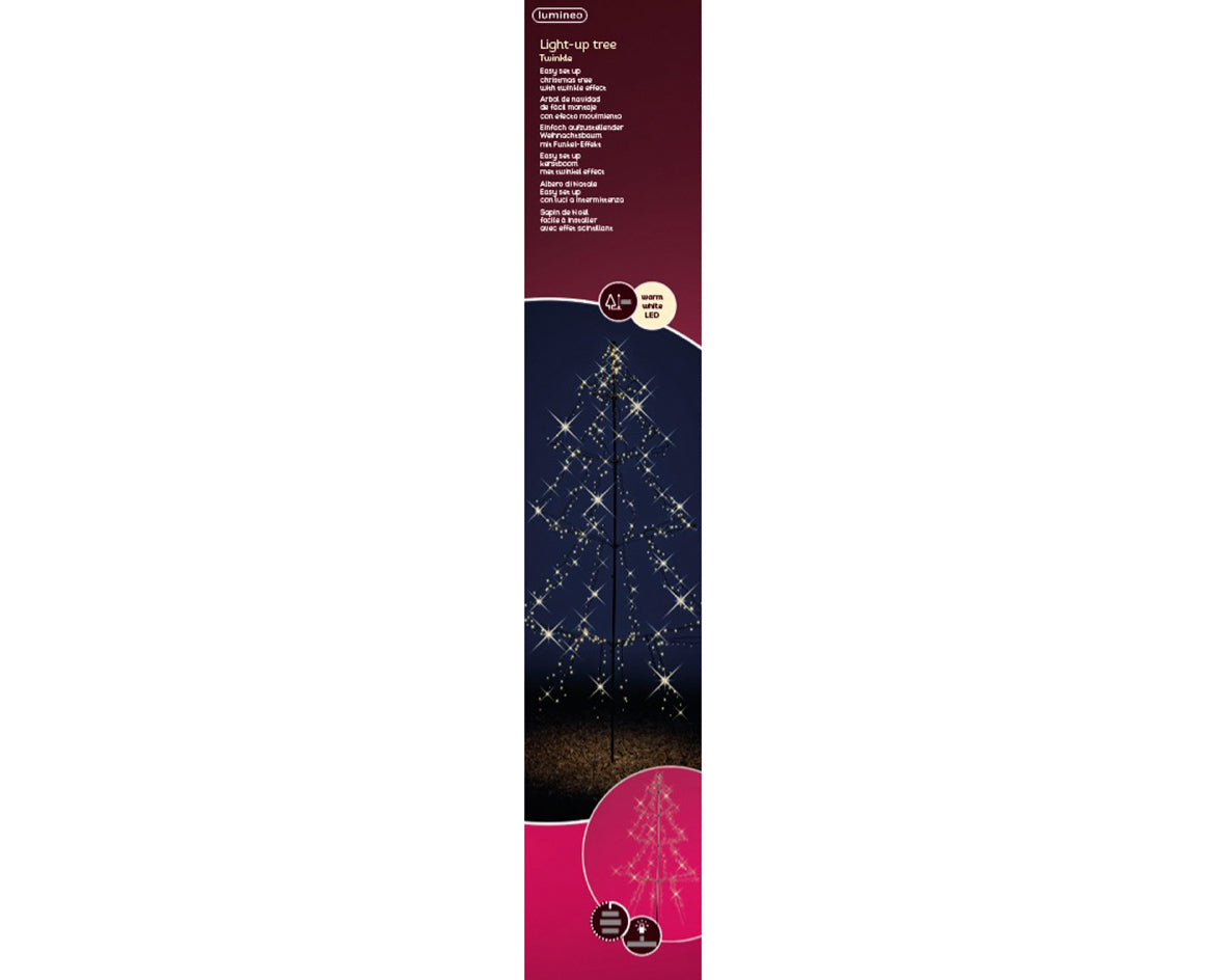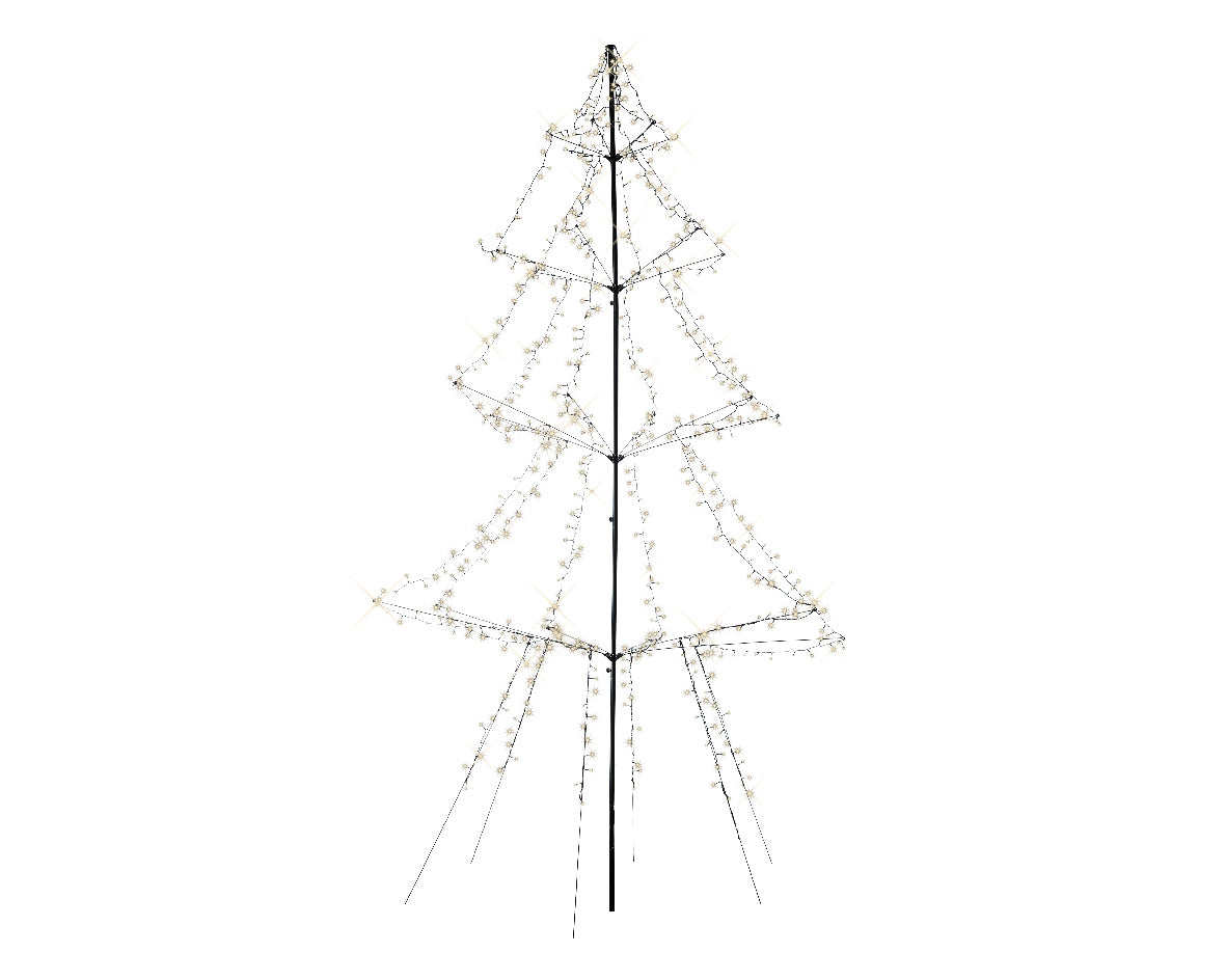 Albero decorativo in metallo nero con 600 LED bianco caldo da 3 mm a 8 funzioni con effetto twinkle. Struttura alta 3 metri con diametro 180 cm, ideale per giardini, viali o spazi esterni. Dotato di timer 8 ore, alimentazione a trasformatore incluso e cavo di collegamento da 5 m. Grado di protezione IP44 per uso esterno, certificato CE.