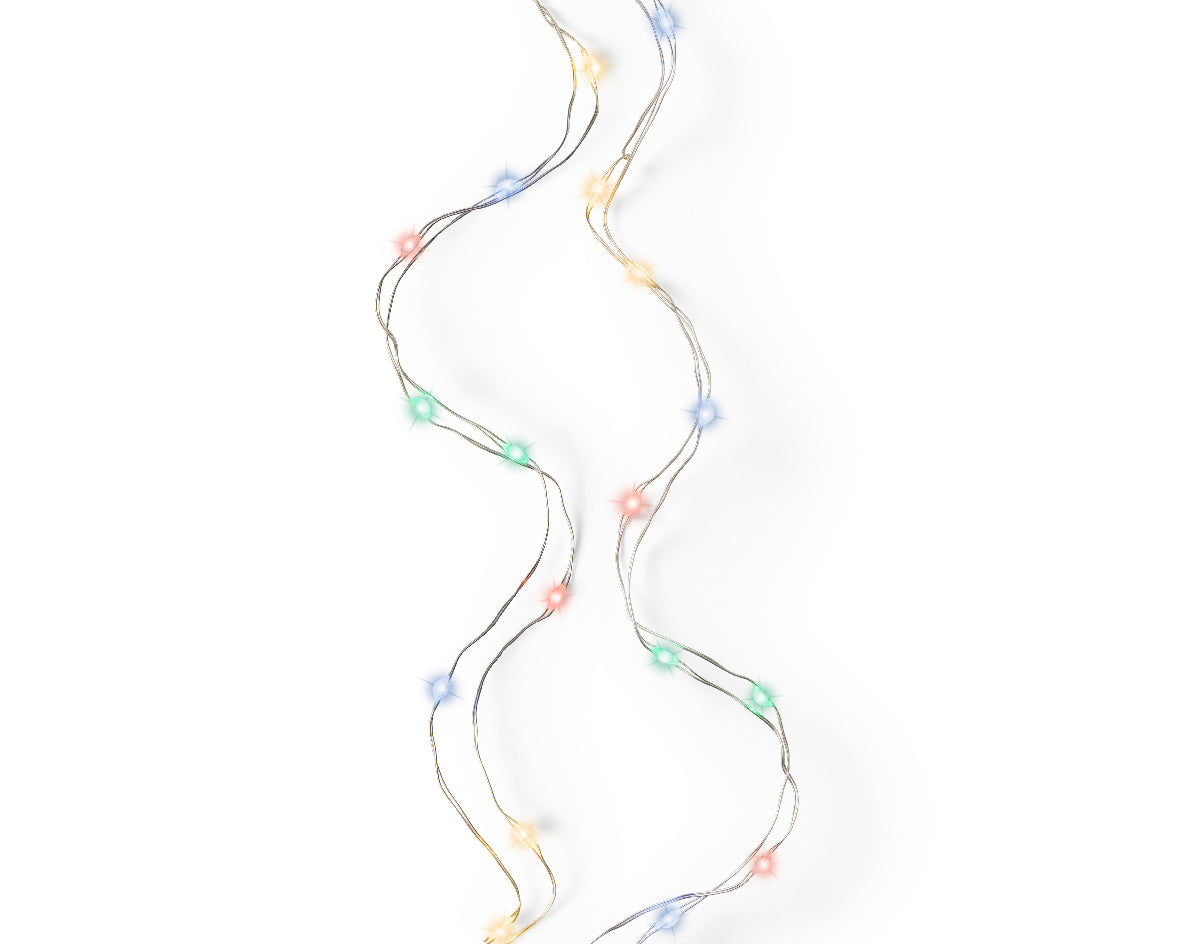 Catena luminosa a batteria con 100 micro LED multicolore montati su cavo argento, perfetta per decorare ambienti interni con un tocco vivace e colorato. Dotata di timer 6h per accensione automatica giornaliera. Funzionamento con 3 batterie AA (non incluse). Certificata LED safety EN62471, RoHs e conforme agli standard CE/UKCA.