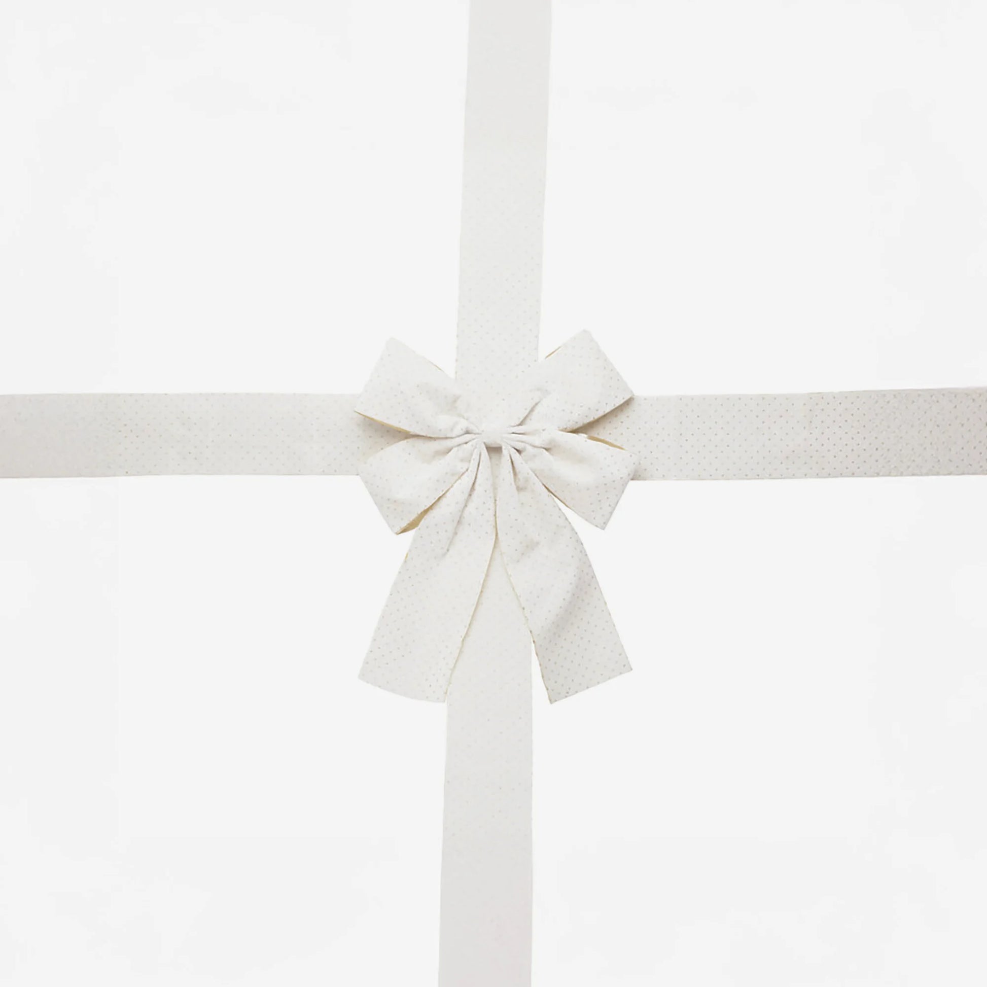 Elegante fiocco decorativo per porta in velluto bianco con puntini dorati e retro dorato, ideale per donare un tocco raffinato e luminoso alle decorazioni natalizie.