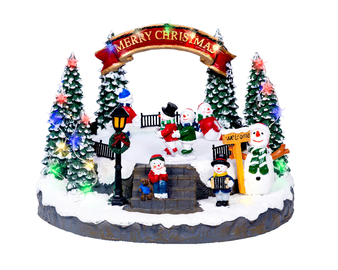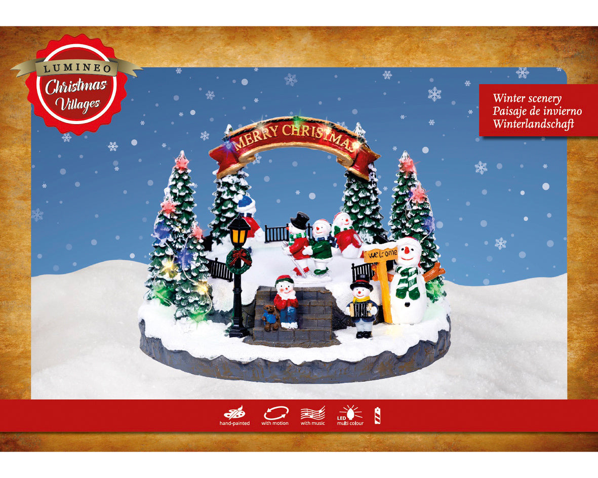 Questo scenario Kaemingk in poliresina raffigura una scena natalizia vivace della collezione Holiday Adventures. Illuminato da 35 LED (3 mm) a luce multicolore con effetto flashing, offre movimento e musica per un’atmosfera spettacolare. Funziona a batteria (3×AA, non incluse) ed è pensato per uso interno.