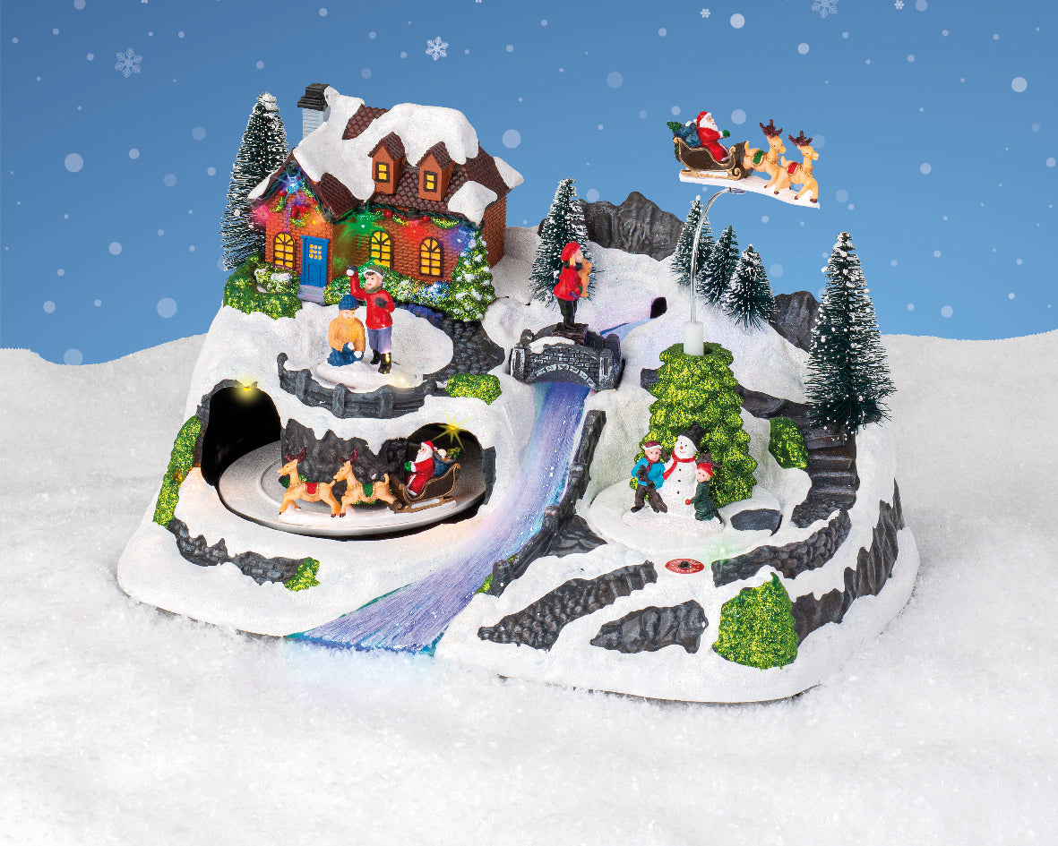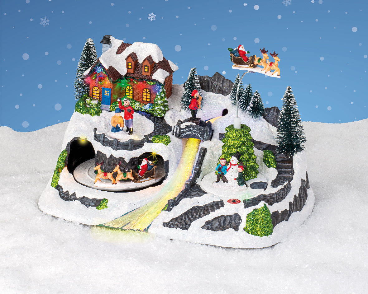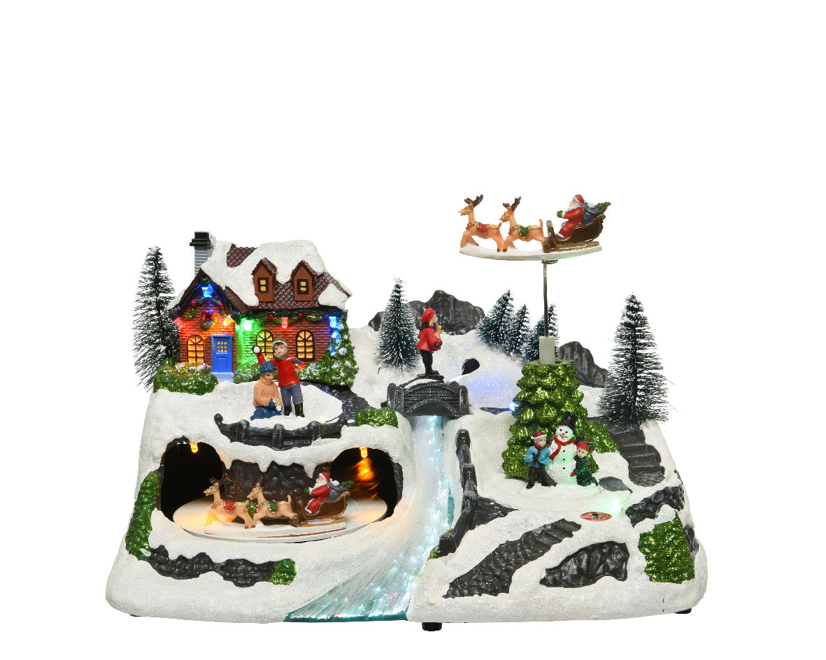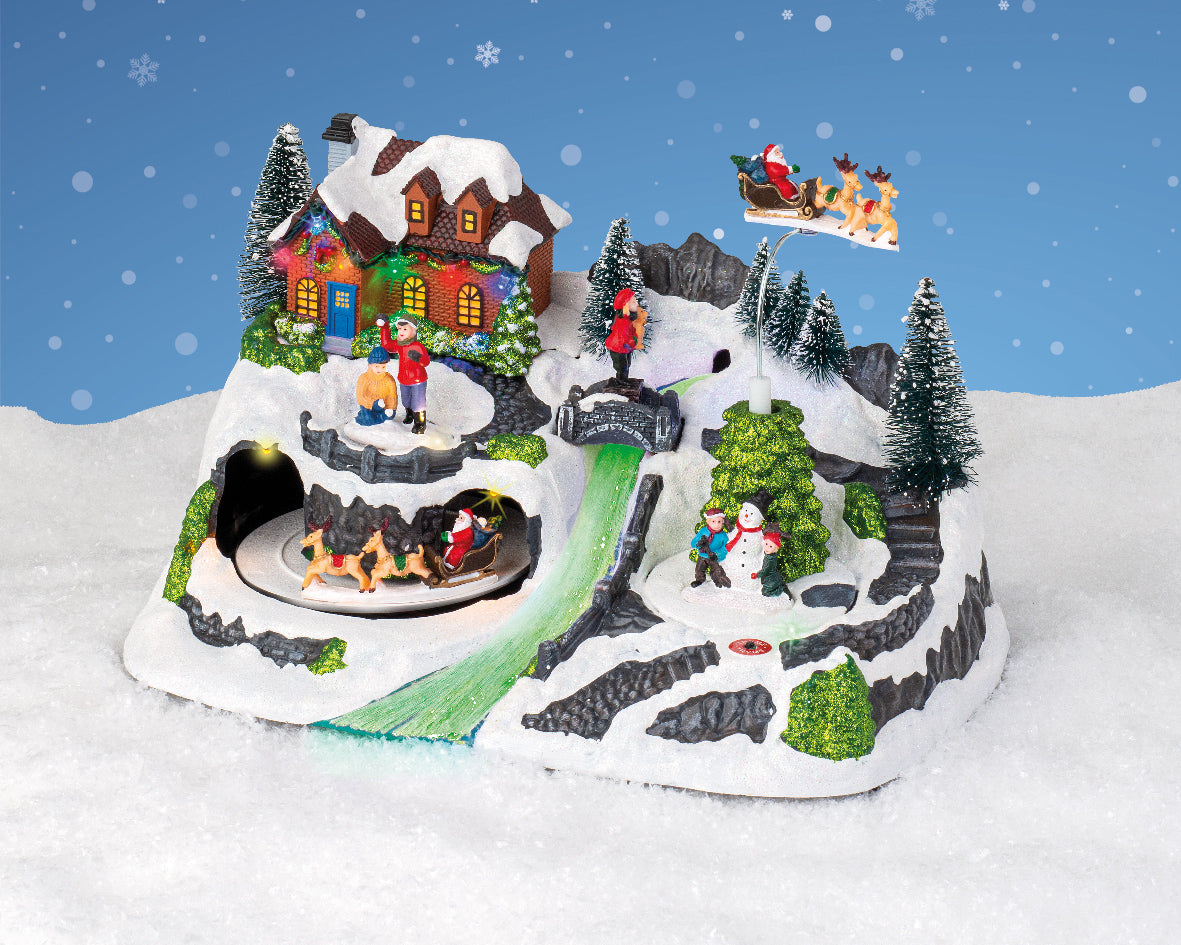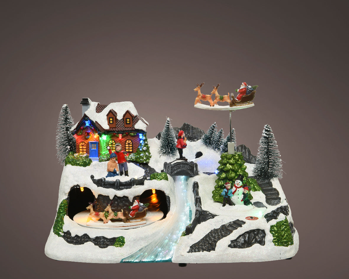 Decorazione natalizia artigianale Slitta in movimento con 12 LED multicolore a cambio colore, musica integrata e dettagli curati. Parte della collezione Christmas Villages di Lumineo. Funzionamento a batterie AA (incluse) o tramite alimentazione DC. Realizzata a mano, ideale per arricchire scenari e ambientazioni natalizie. Certificata LED safety EN62471, RoHs e conforme a CE/UKCA.